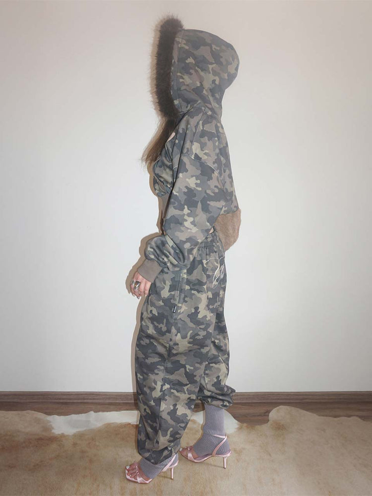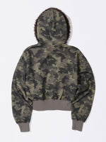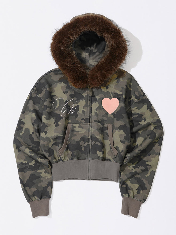 Faux Fur Trimming Hooded Zip-Up Forest Camo